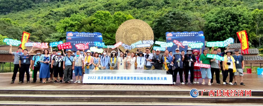 图一、参加“2022年清凉暑期德天跨国观瀑节暨玩转桂西南祭水大典”的嘉宾、游客、媒体记者、摄影师们。(赵成艺 摄)