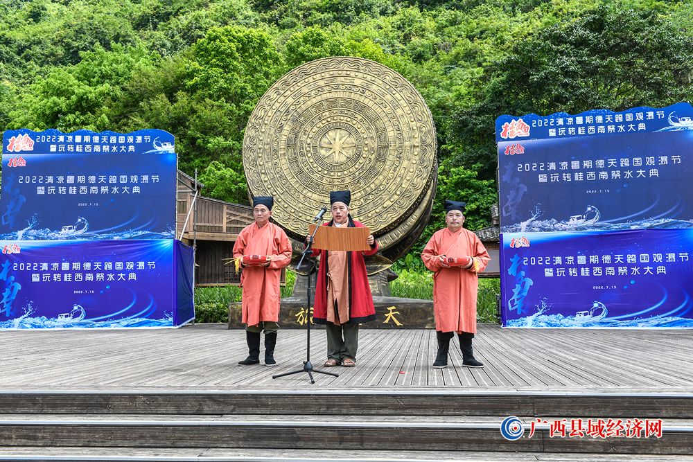 图二、来自桂西南大德天边关旅游目的地拥有水资源的景区代表共同参与玩转桂西南祭水大典祈福仪式。(赵成艺 摄)