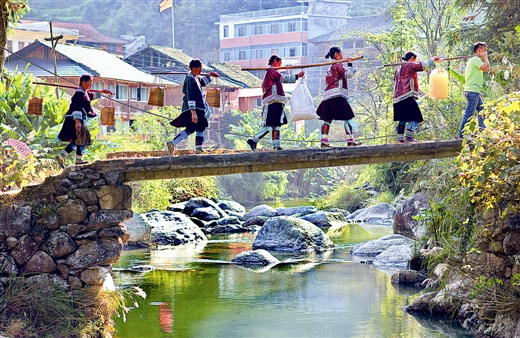 水碾房在溪流边吟唱古老的歌谣,清澈见底的河水从木楼前潺潺流过,穿着七彩服饰的苗家妇女挑着担子从夕阳的山野里劳作归来……融水苗族自治县杆洞乡小河村是柳州市委宣传部的对口扶贫村。驻村干部扎根村寨,带领干部群众硬化村道、修建桥梁、美化家园,并在该县畜牧水产局的支持下发展禾花鱼养殖业,吸引不少游客来到这如诗如画的乡村品味淳朴乡愁。