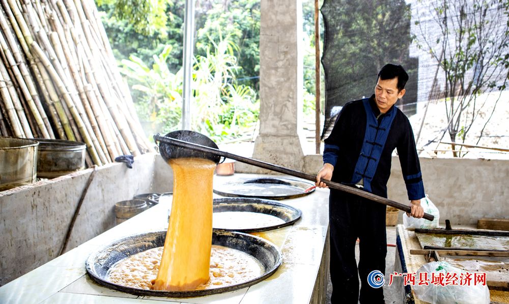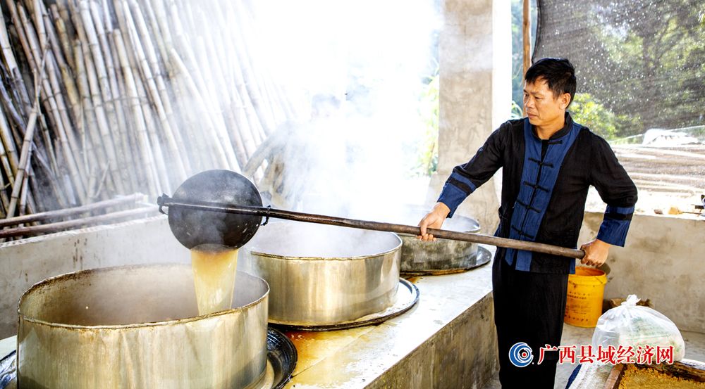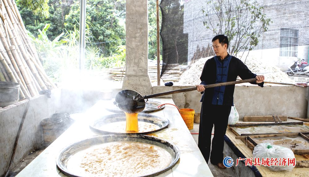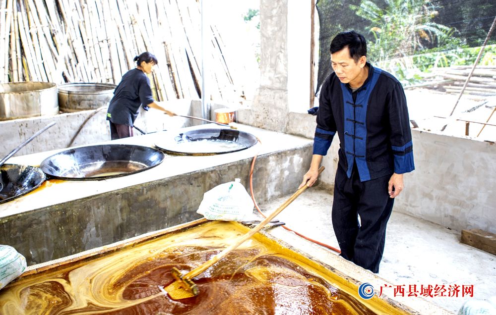 世界文化遗产地——广西宁明花山岩画脚下的城中镇耀达村灰窑屯群众正在抓紧生产手工红糖。伍明 摄