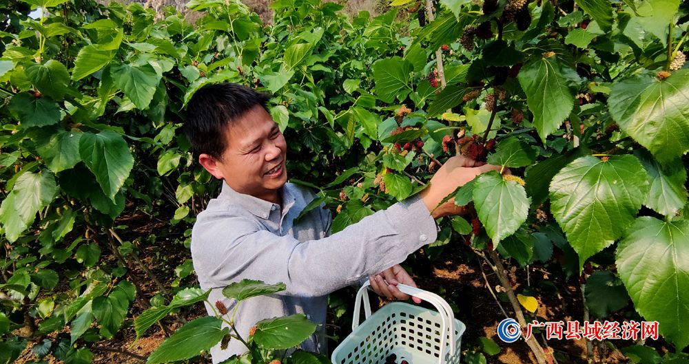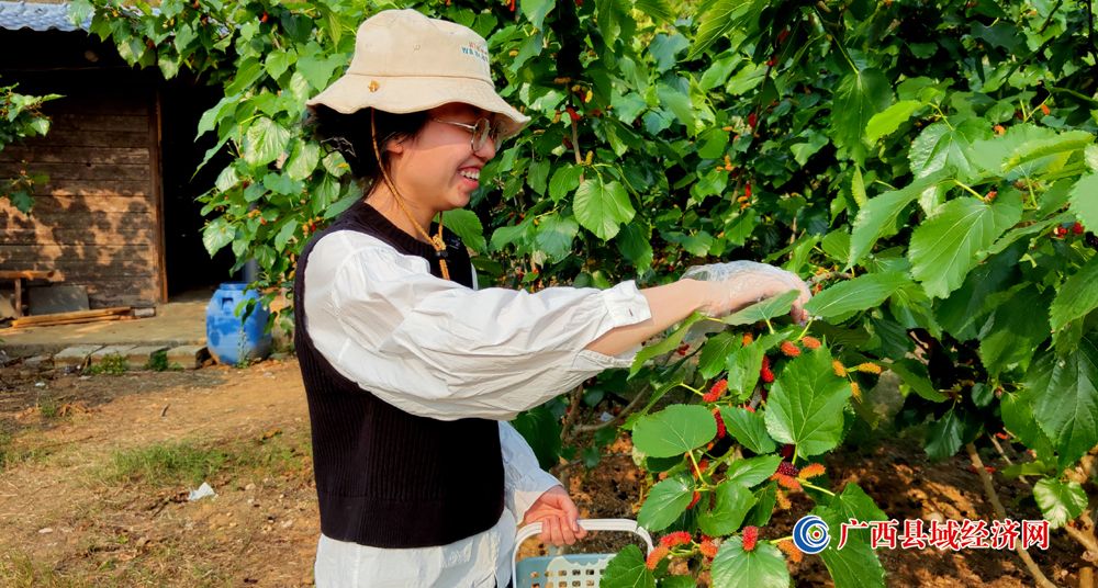 图二、3月14日,一名游客在广西宁明县城中镇珠连村攀龙桑葚园满心欢喜体验采摘成熟桑葚的乐趣。(周贻刚 摄)