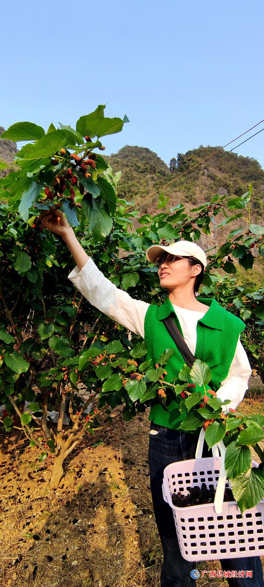 图一、3月14日,一名游客在广西宁明县城中镇珠连村攀龙桑葚园满心欢喜体验采摘成熟桑葚的乐趣。(周贻刚 摄)