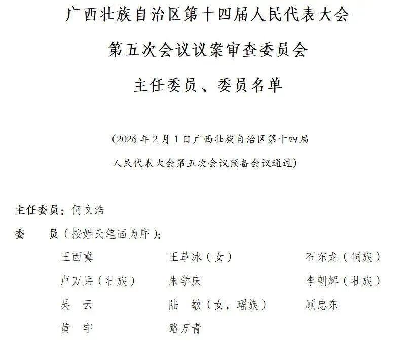 广西壮族自治区第十四届人民代表大会第五次会议议案审查委员主任委员、委员名单(2026年2月1日广西壮族自治区第十四届人民代表大会第五次会议预备会议通过)主任委员:何文浩 【详细】